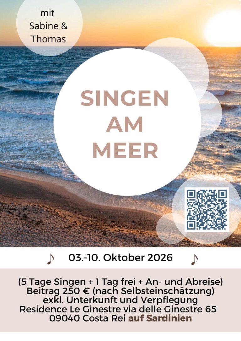 Die Apartments und der Raum, in dem wir singen, liegen in unmittelbarer Nähe zum Meer. Wir beginnen den Morgen mit Chi Gong am Strand, gefolgt von einer Meditation im Gruppenraum. Nach dem selbst organisierten Frühstück beginnen wir mit dem Singen. Die Auswahl der Lieder orientiert sich, wie sonst auch, an universellen Themen und dem, was wir als Gruppe mitbringen und in einer gemeinsamen Runde morgens zusammentragen. Mittags essen wir alle zusammen im benachbarten Restaurant, das Abendessen organisiert sich wieder jede/r selbst. Das Meer und dieser spezielle Ort werden uns erfahrungsgemäß einladen, eine stimmige Balance aus Zeiten des Singens und des Ausruhens zu finden, geplant ist eine Singeinheit von ca. 1.5 Stunden am Nachmittag. Einen Tag lassen wir frei für Ausflüge oder andere Aktivitäten. An den Abenden planen wir noch Zeit für gemeinsame Aktivitäten wie z.B. einem Gongkonzert oder einem Tanzabend.